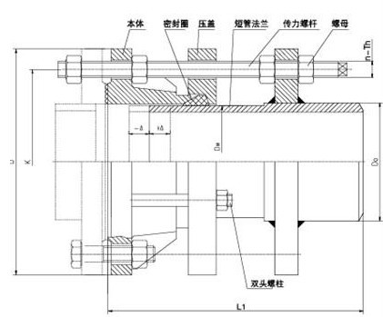 松套傳力接頭是在法蘭松套補償接頭的基礎上增設法蘭短管及傳力螺桿而成,次類型的補償接頭與松套補償接頭和松套限位補償接頭不同的是它的補償量是指在安裝及拆卸過程中的調節(jié)量,一旦將所有的螺母擰緊,它是剛性連接的,可以傳遞軸心力,從而保護閥門、泵等設備。